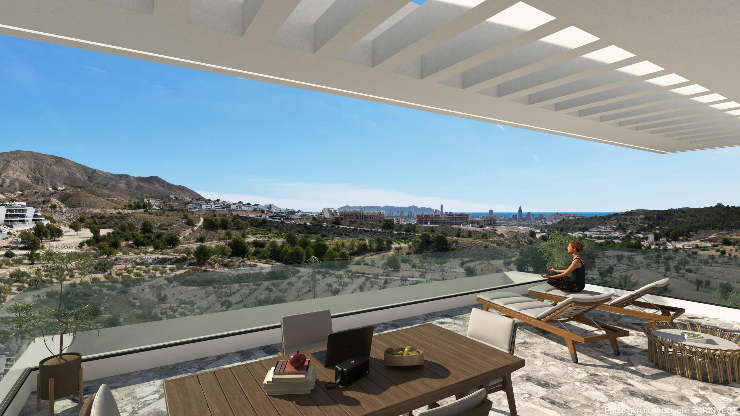 Magnifique appartement à Finestrat de 2 chambres et 2 salles de bain offrant de belles vues sur la mer et la baie de Balcon de Finestrat avec une grande terrasse de 70 m2 donnant sur une superbe piscine Infinity de 15 x 5m.