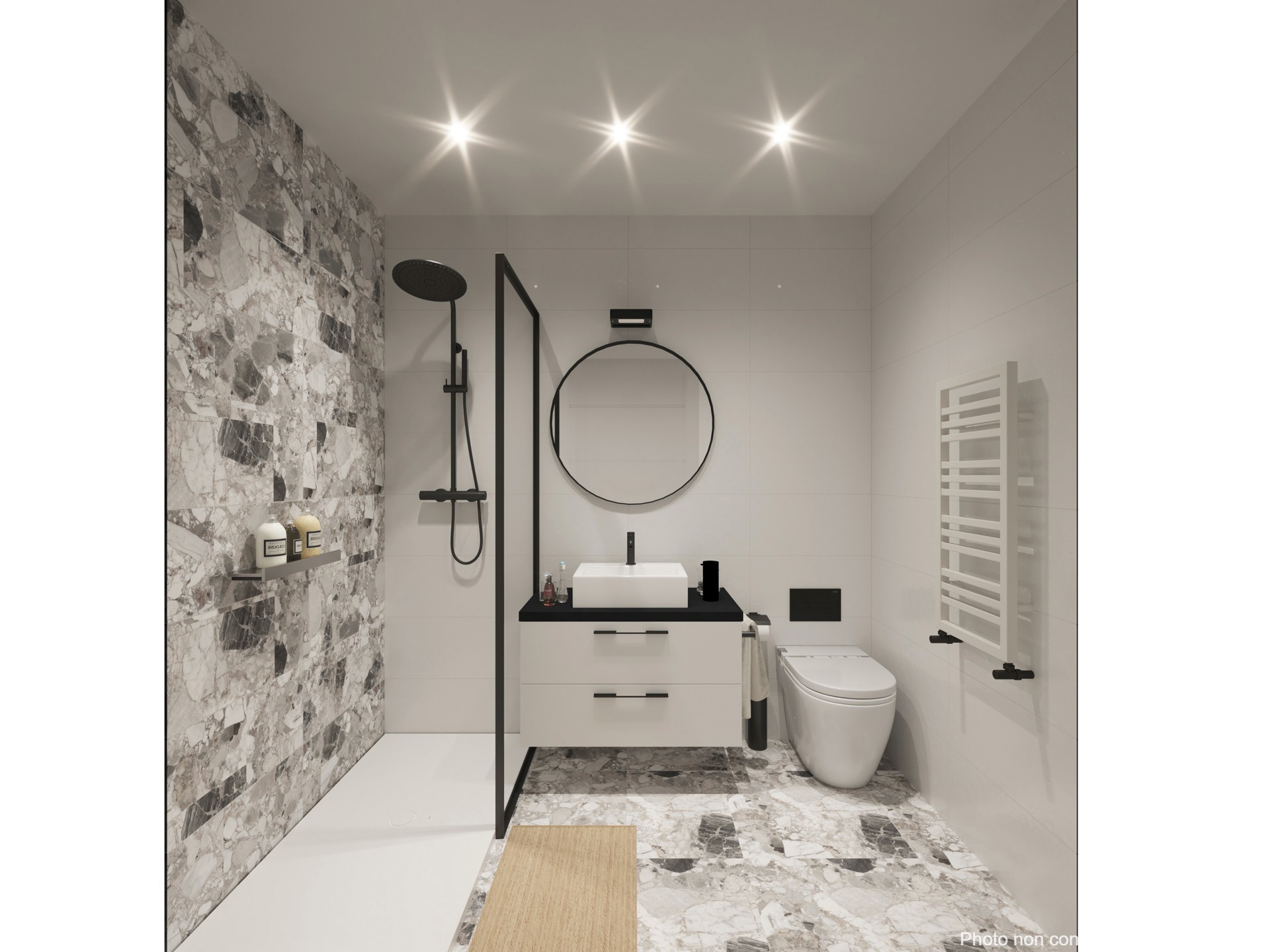 De plus, tous les extras tels que les électroménagers de la cuisine, le système de climatisation chaud/froid centralisé, le chauffage au sol dans les salles de bain ainsi qu'un emplacement de parking sous-terrain et une cave sont également inclus dans le prix.