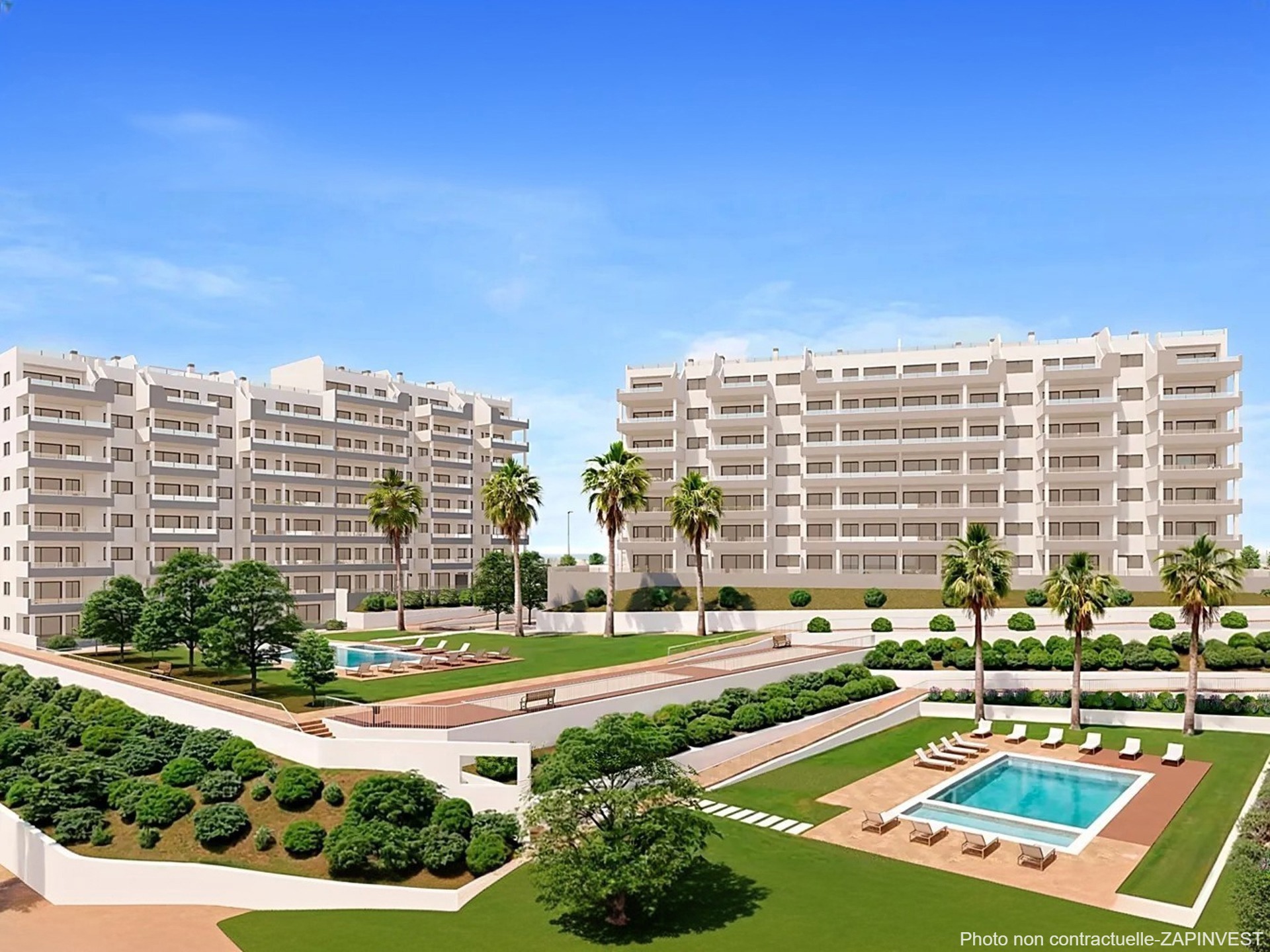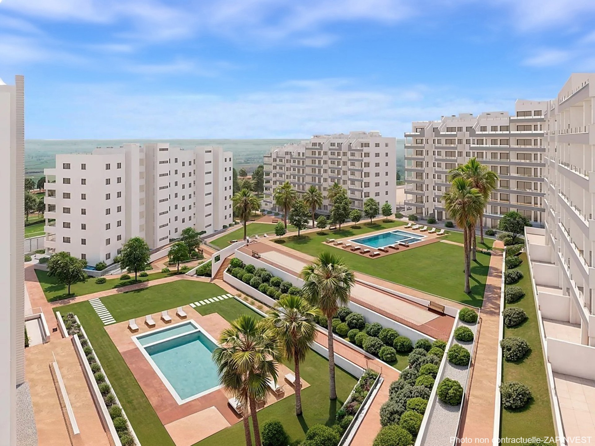 Tous donnent directement sur une immense zone de jardin avec 3 piscines communes entourées d’espaces verts, laissant ainsi de grandes distances entre chaque bloc et offrant plus d’intimité.