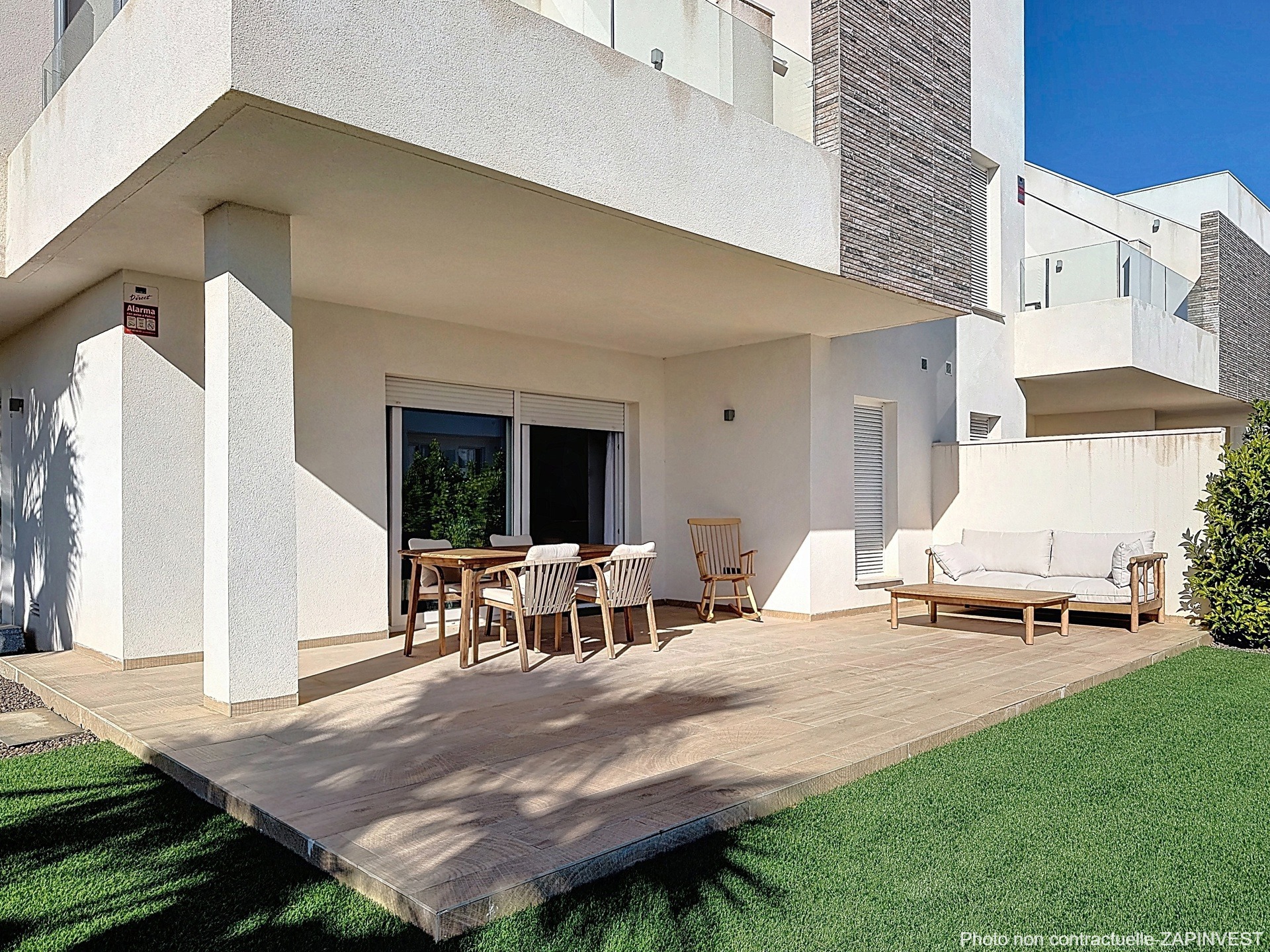 L'appartement est spacieux et lumineux avec un accès direct, depuis la belle baie vitrée du salon, à une ample terrasse couverte donnant sur un immense jardin avec gazon artificiel et zone verte de plus de 80 m².