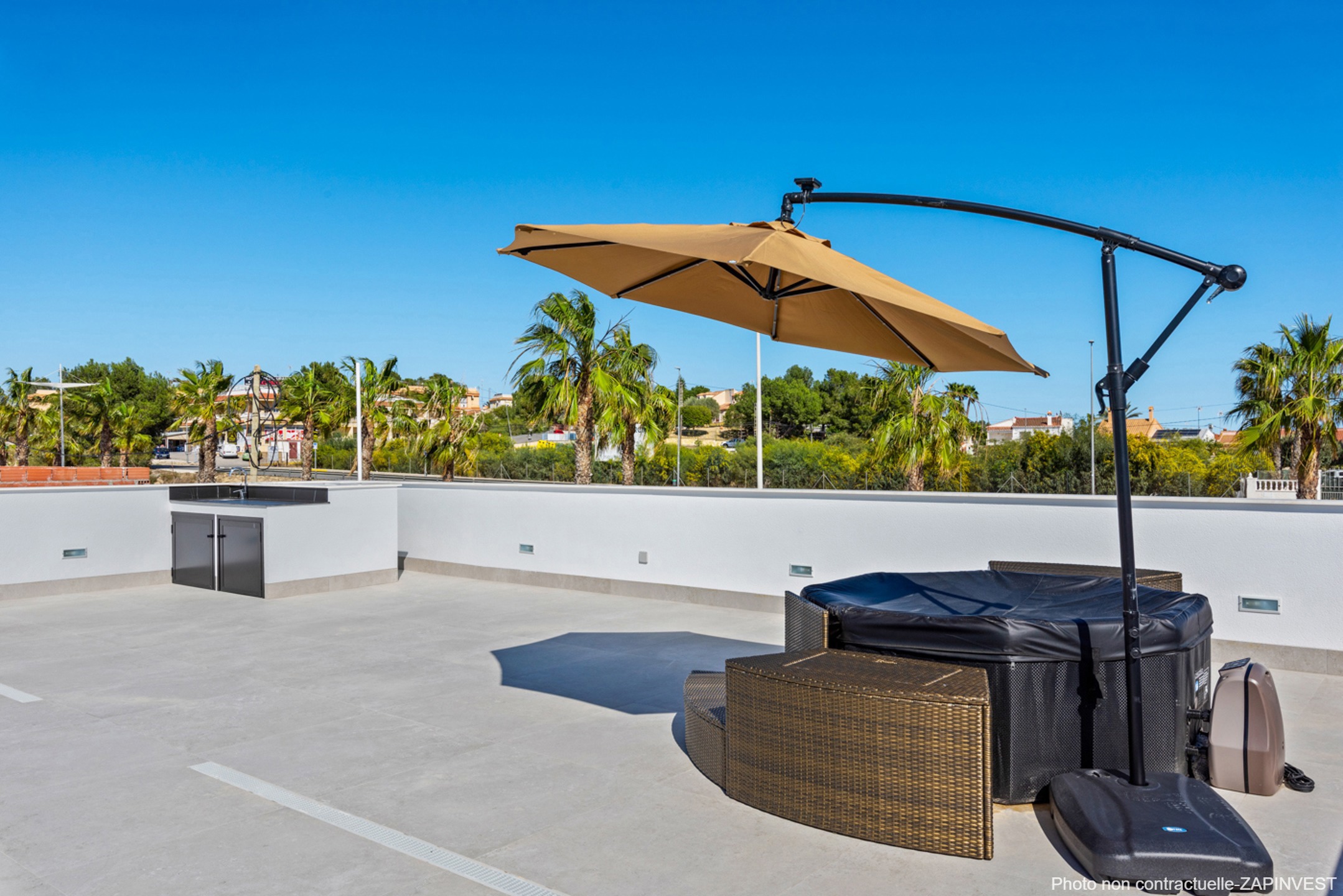 Cette villa est implantée sur un magnifique terrain indépendant, clos et aménagé, d’environ 500m² avec une très grande piscine privée(inclue dans le prix), une superbe terrasse solarium de 150m² sur le toit avec pergola et cuisine d'été, et également un parking intérieur sur la parcelle.