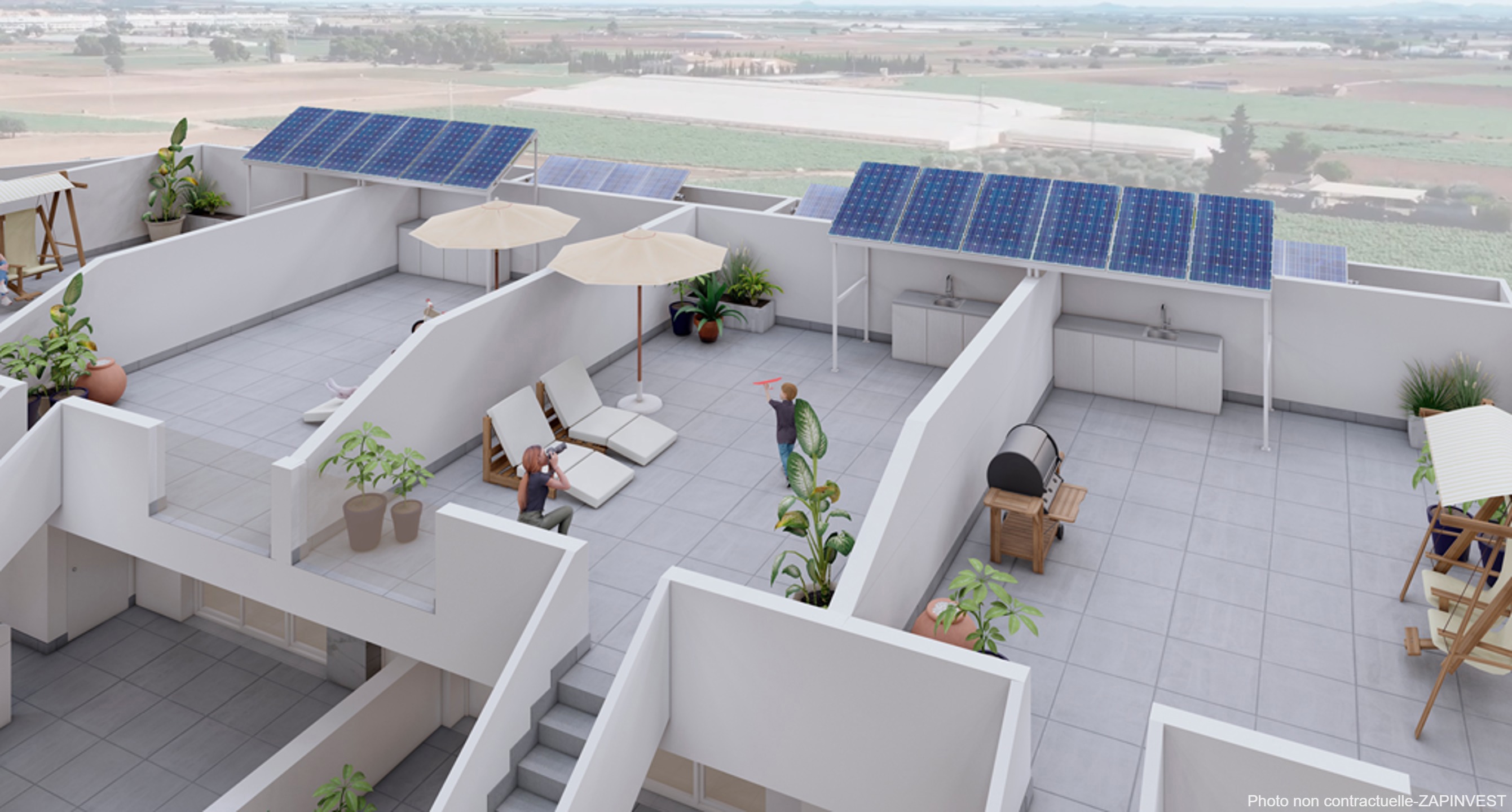Superbe appartement en premier étage de 2 chambres et 2 salles de bain avec une terrasse de 15 m² au niveau du salon et d’un solarium de 45m2.