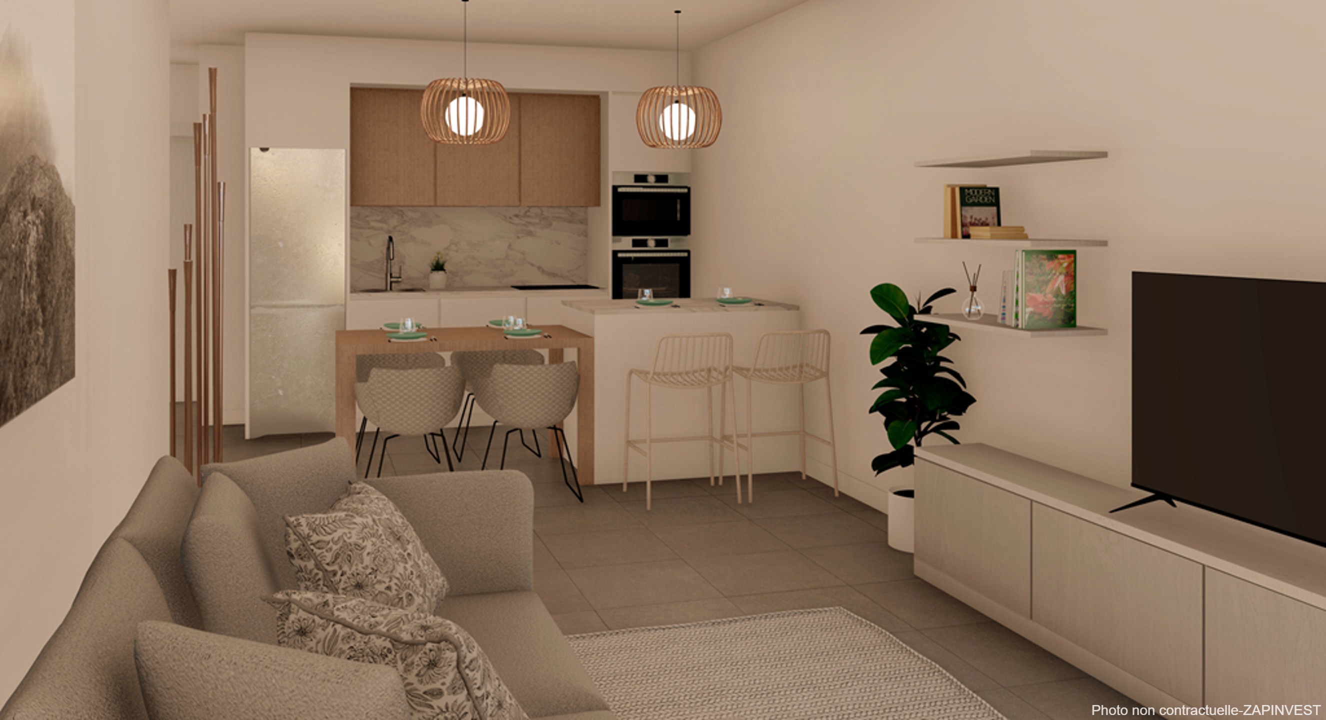 Le bien est vendu avec la cuisine équipée en électroménagers ainsi qu'un salon donnant sur la piscine commune et ses zone vertes.