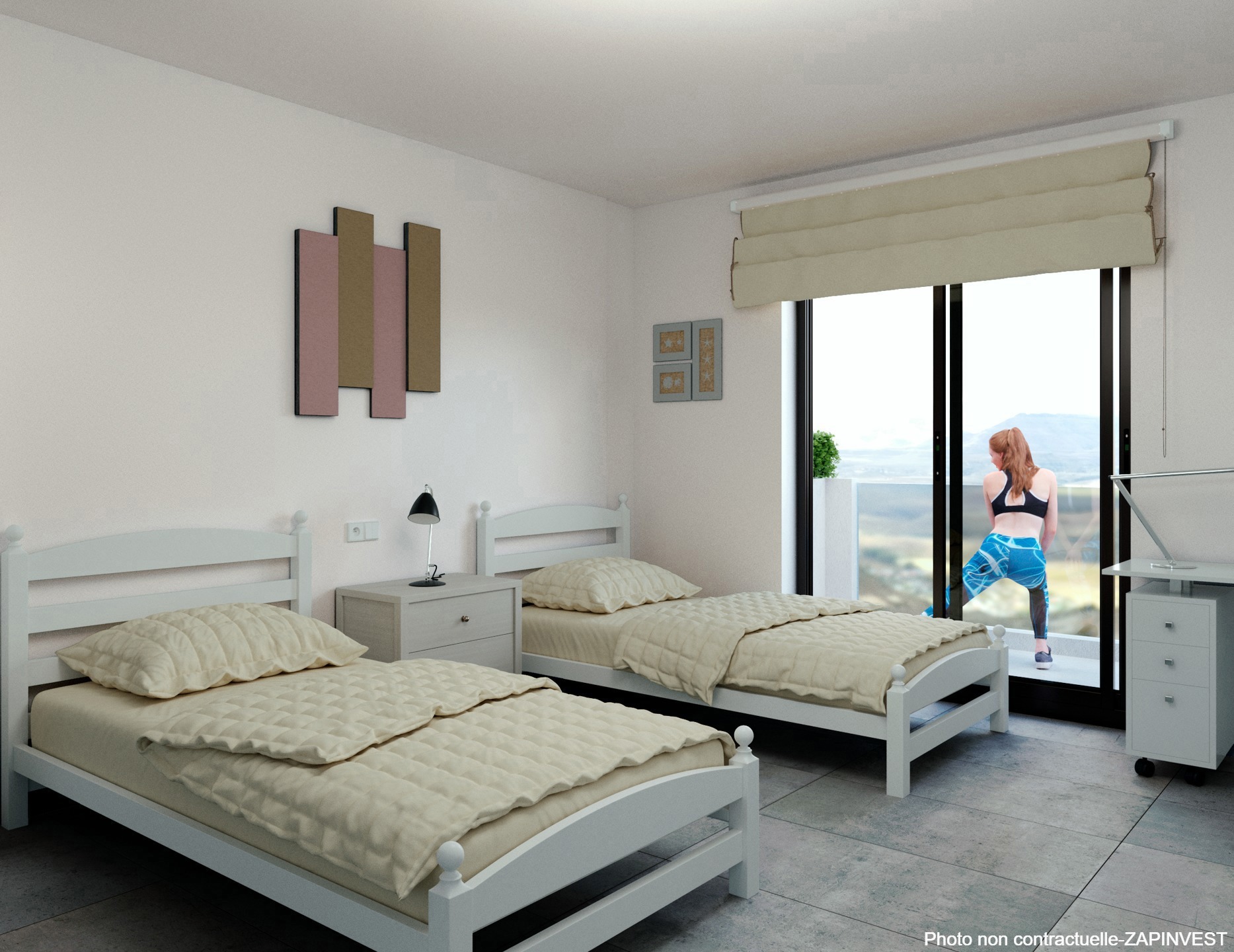 Cette splendide villa jumelée de 3 cambres et 2 salles de bain est construite sur 2 étages; au rez de chaussée se trouvent le salon / salle à manger avec belle cuisine américaine ouverte, une chambre avec salle de bains indépendante, une buanderie et beaucoup de luminosité grâce à son accès à la terrasse avec piscine par les grandes baies vitrées.