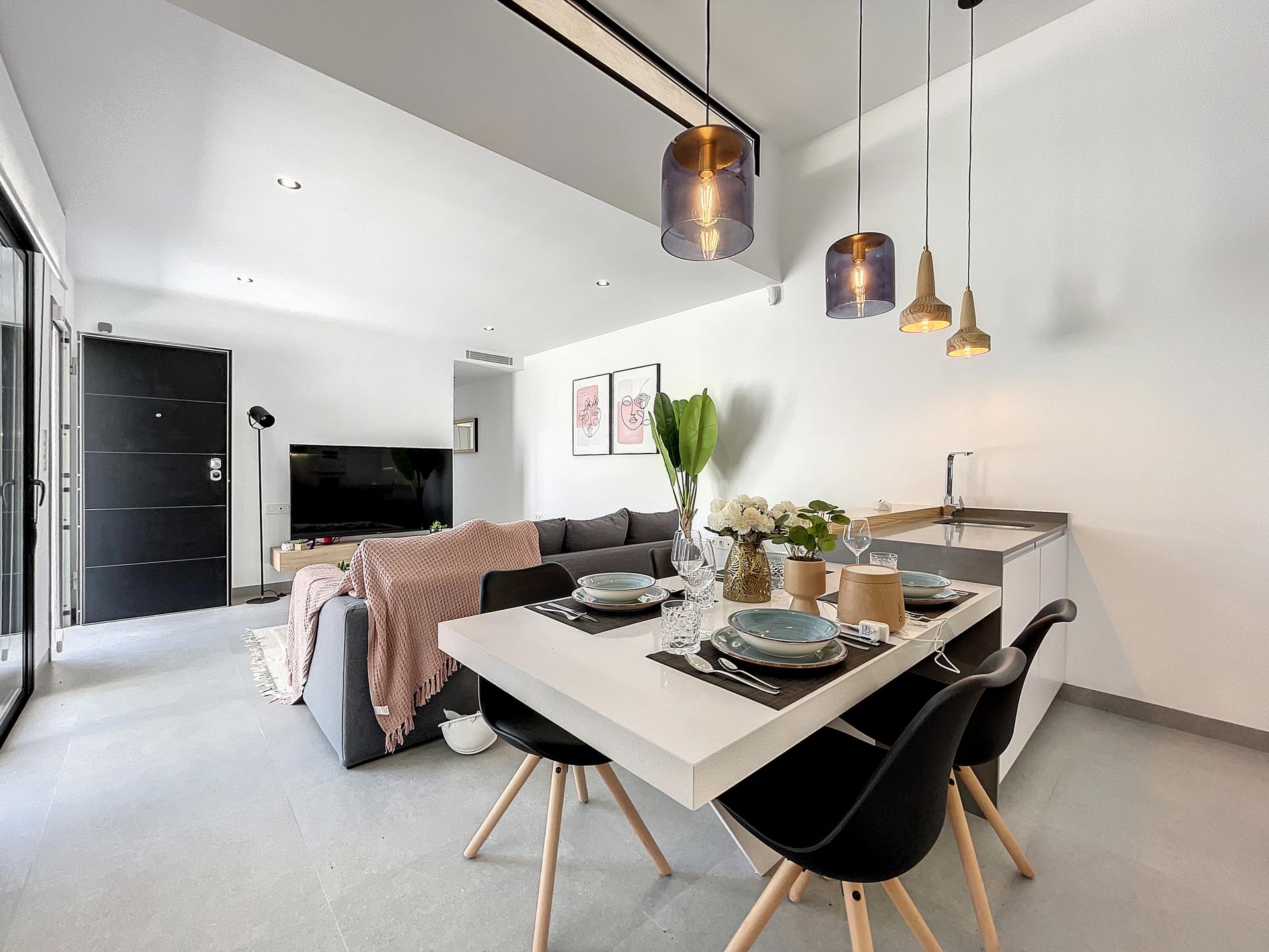 Cette villa de 3 chambres et 2 salles de bains offre une atmosphère moderne et spacieuse avec un haut plafond voûté, une cuisine et un salon ouvert.