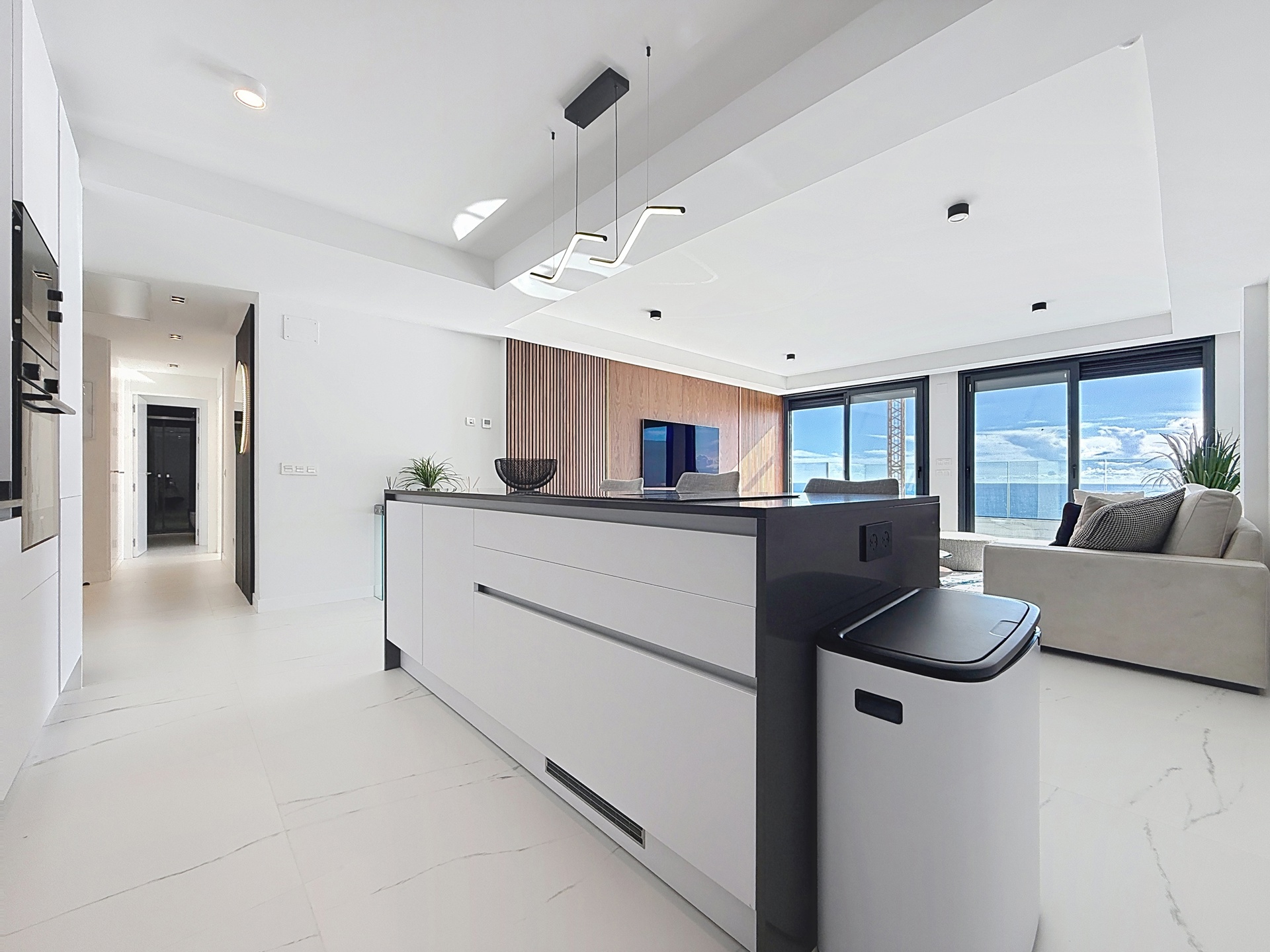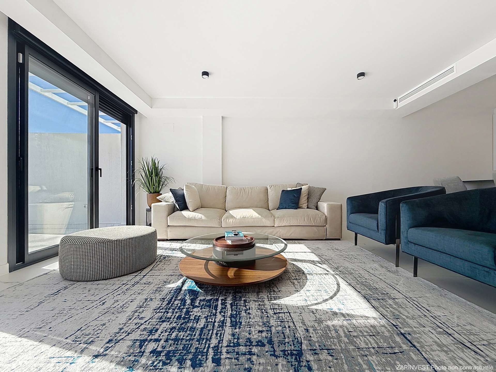 L’espace de vie a été pensé pour une vie dedans-dehors fluide : une cuisine ouverte entièrement équipée, avec îlot central, s’ouvre naturellement sur la salle à manger et le salon. L’ensemble se prolonge sur une magnifique terrasse de plus de 40 m², véritable pièce à vivre extérieure, idéale pour les repas, la détente et les soirées face à la Méditerranée.
