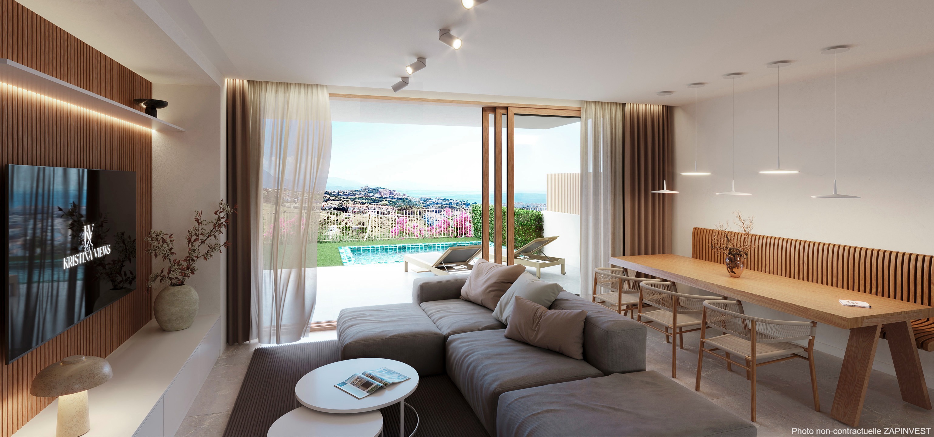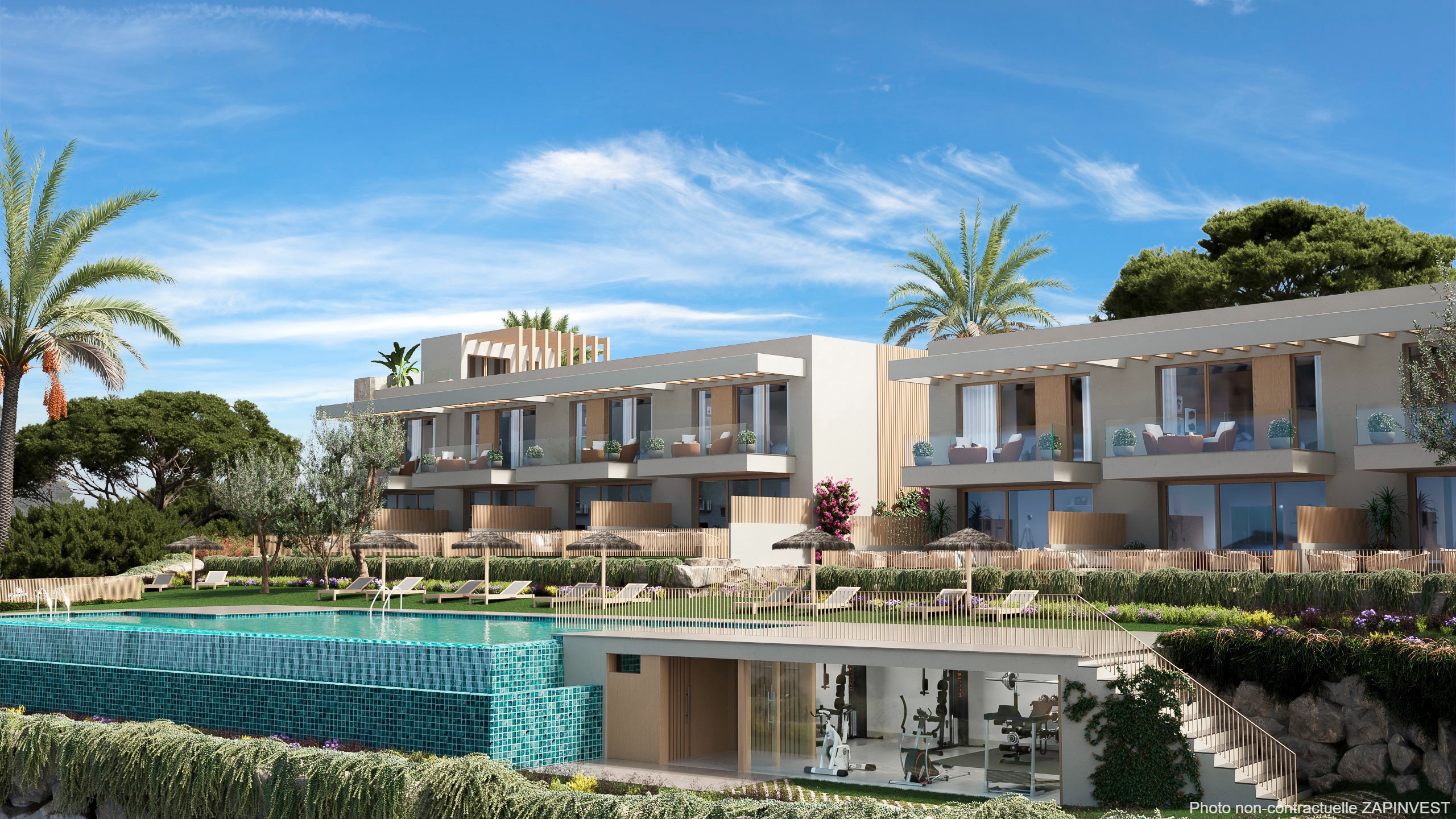 Une belle offre comprenant un garage intégré pour 1 voiture, salon extérieur au rez-de-chaussée donnant sur la piscine (en option), espaces ouverts et terrasses, grande véranda privée, cuisine et salon ouverts avec plus de 6 mètres de façade sur l'avant, cuisine équipée avec de grands éléments muraux et bas, finition en stratifié/laminé, similaire; Équipements inclus : éclairage LED dans les éléments muraux, hotte aspirante intégrée, lave-vaisselle, lave-linge, réfrigérateur, micro-ondes, plaque à induction 3 zones et four en acier inoxydable ; luxueuse chambre principale avec salle de bains attenante, armoire/commode encastrée, douche à effet pluie avec paroi en verre, WC séparés, double vasque et dressing spacieux. 2 chambres supplémentaires dont une avec terrasse extérieure ; .