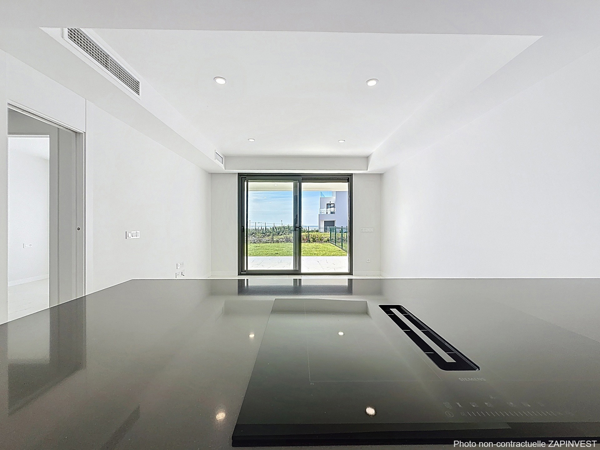 Il comprend une cuisine ouverte avec ilôt central donnant sur la salle à manger et le salon, le tout sur la magnifique terrasse et jardin de plus de 100m2 au total, offrant des vues mer.