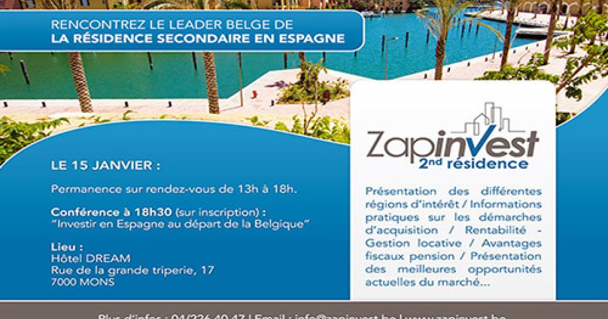 Ce jeudi 15 janvier à 18h30, Zapinvest organise une conférence sur le thème "Investir en Espagne au départ de la Belgique" à l'hôtel Dream à Mons. Celle-ci durera environ 1h30 et sera suivie d'une heure de questions-réponses.