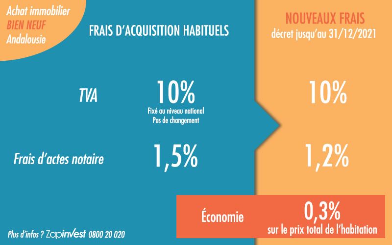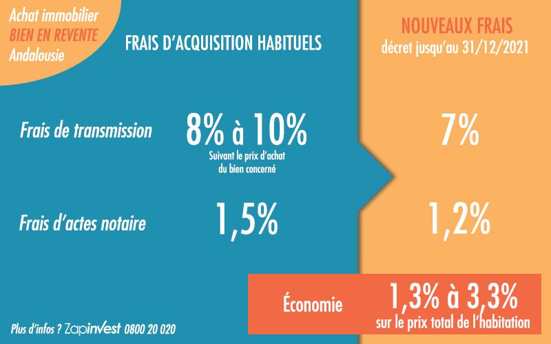 Le 27 avril 2021, le gouvernement d'Andalousie décidaiy d'une une baisse du taux d'imposition sur l'achat immobilier afin de stimuler et aider à la redynamisation du marché immobilier en cette période post Covid-19. Cette mesure est restée en cours depuis et est donc toujours d'actualité en janvier 2026.