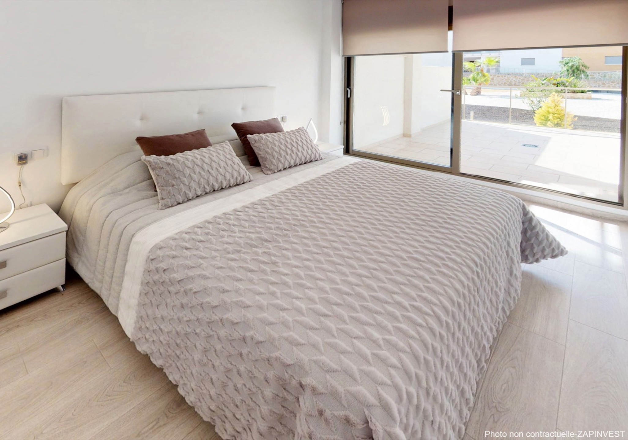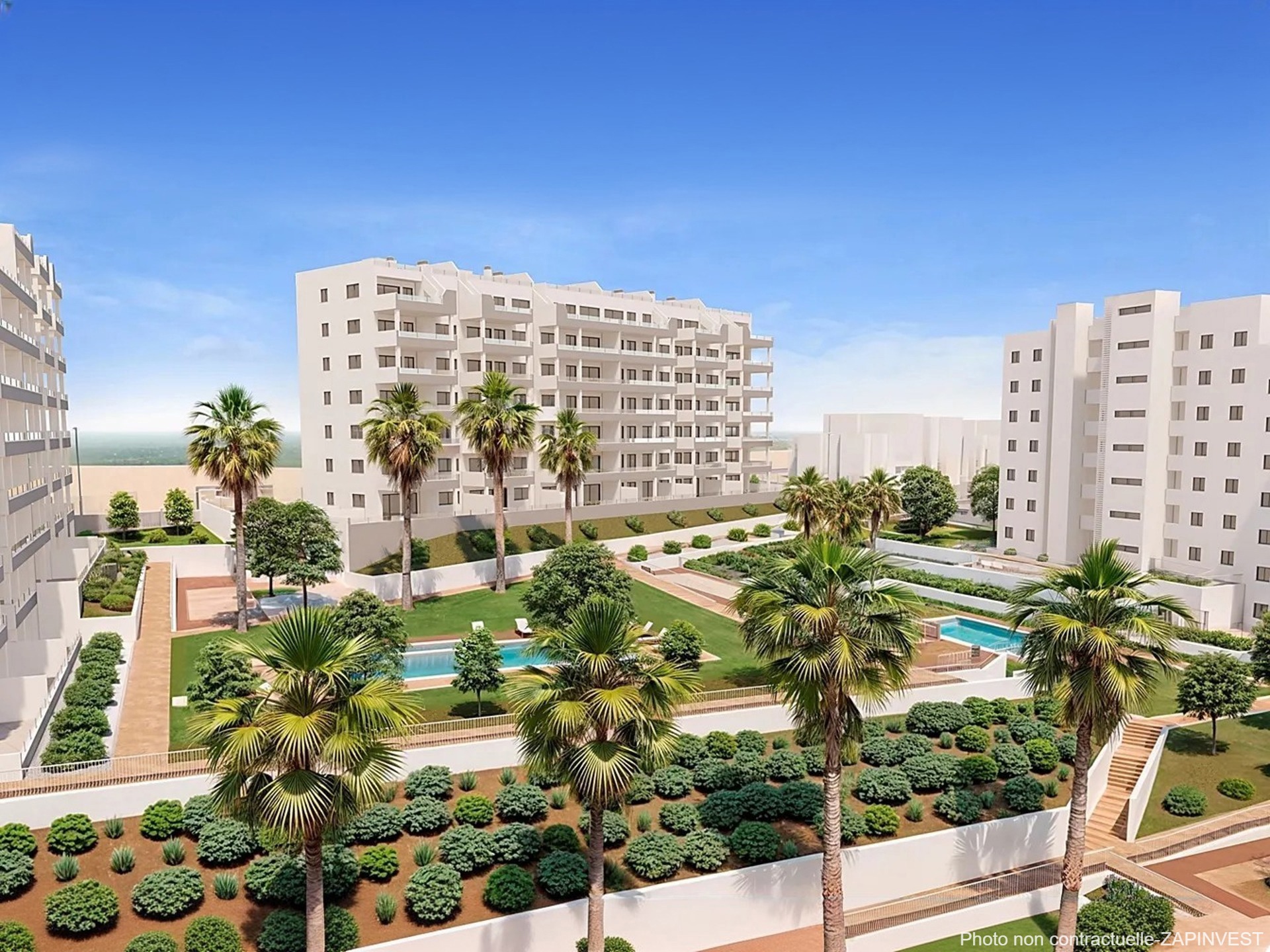 Tous donnent directement sur une immense zone de jardin avec 3 piscines communes entourées d’espaces verts, laissant ainsi de grandes distances entre chaque bloc et offrant plus d’intimité.