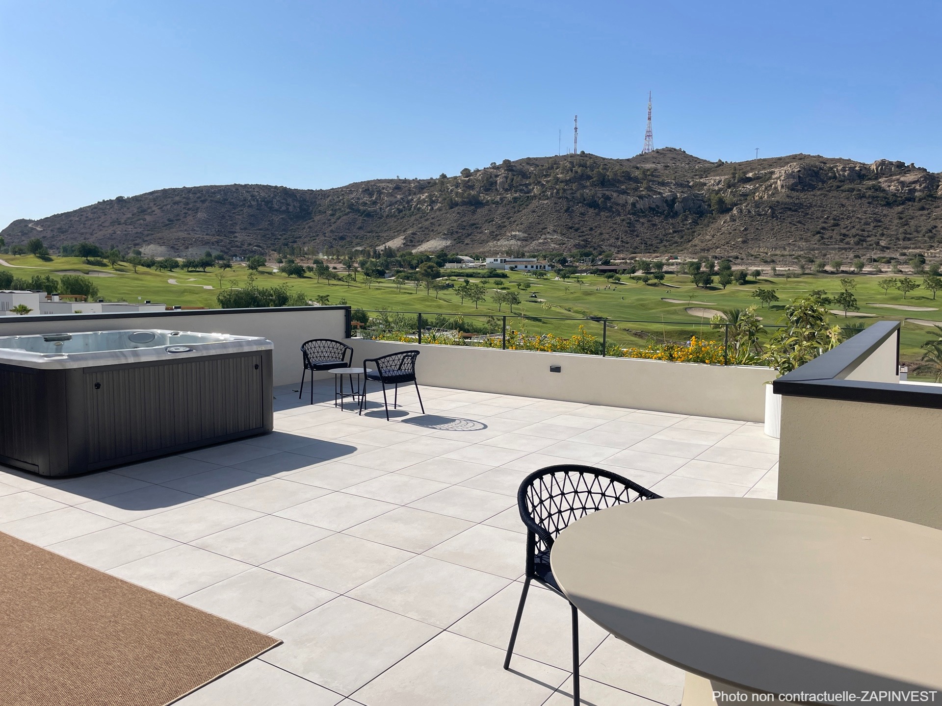 Magnifique duplex, disponible immédiatement, composé de 2 bâtiments de 2 étages avec une très grande terrasse donnant sur le golf et la piscine commune.