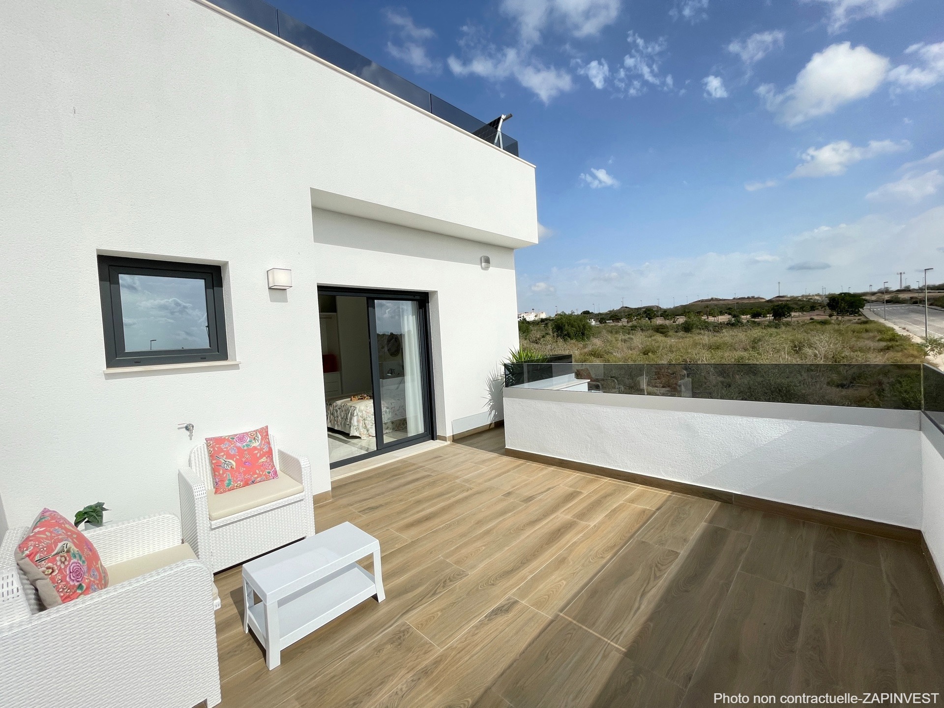 La chambre de l'étage, dispose d'une très belle terrasse supplémentaire. Un solarium (terrasse sur le toit) avec gazon artificiel est également disponible en option.