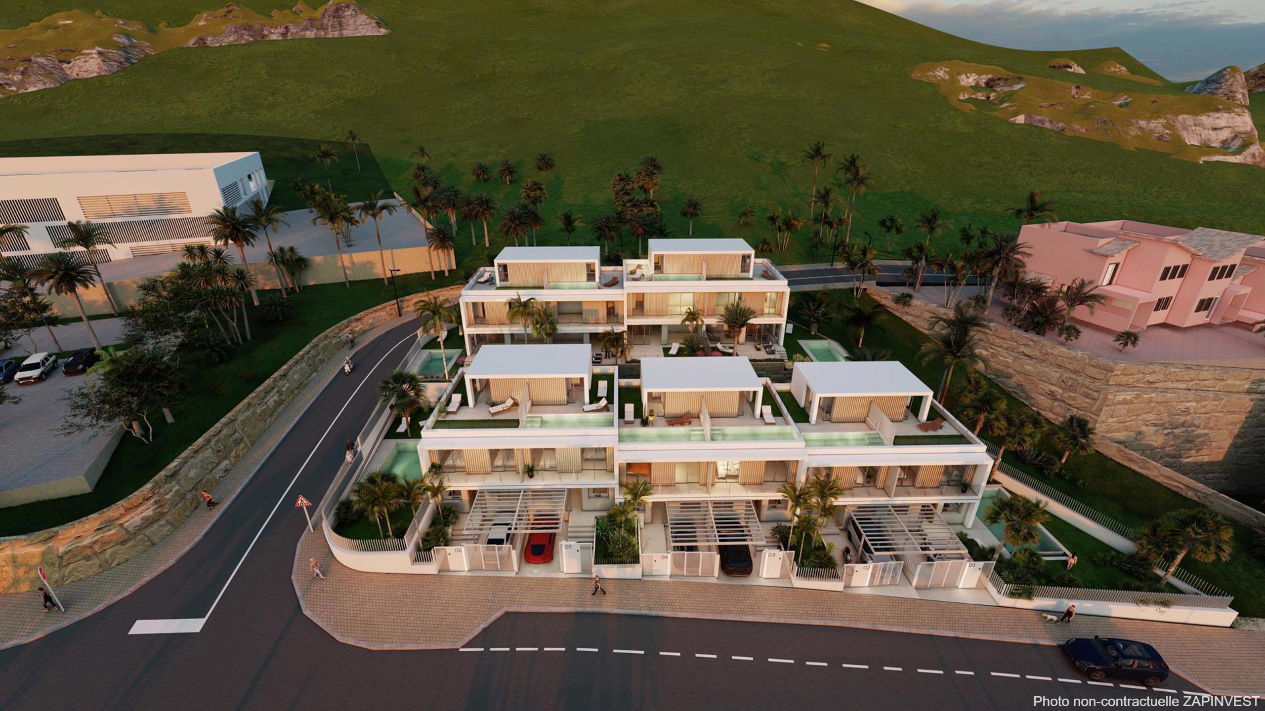 De grandes fenêtres permettent à la lumière de pénétrer dans dans la salle à manger, le salon et la cuisine. Des portes coulissantes en verre donnent accès à la terrasse. Les maisons d'angle disposent d'un jardin privé avec une piscine privée et les autres maisons ont une magnifique terrasse solarium sur le toit avec une piscine privée, idéale pour profiter des vues fantastiques sur la mer. Toutes les villas disposent de 4 chambres, dont une au rez-de-chaussée avec une salle de bains séparée et 2 ou 3 chambres au premier étage avec des salles de bains communes, plus la chambre principale avec une salle de bain attenante magnifiquement aménagée.