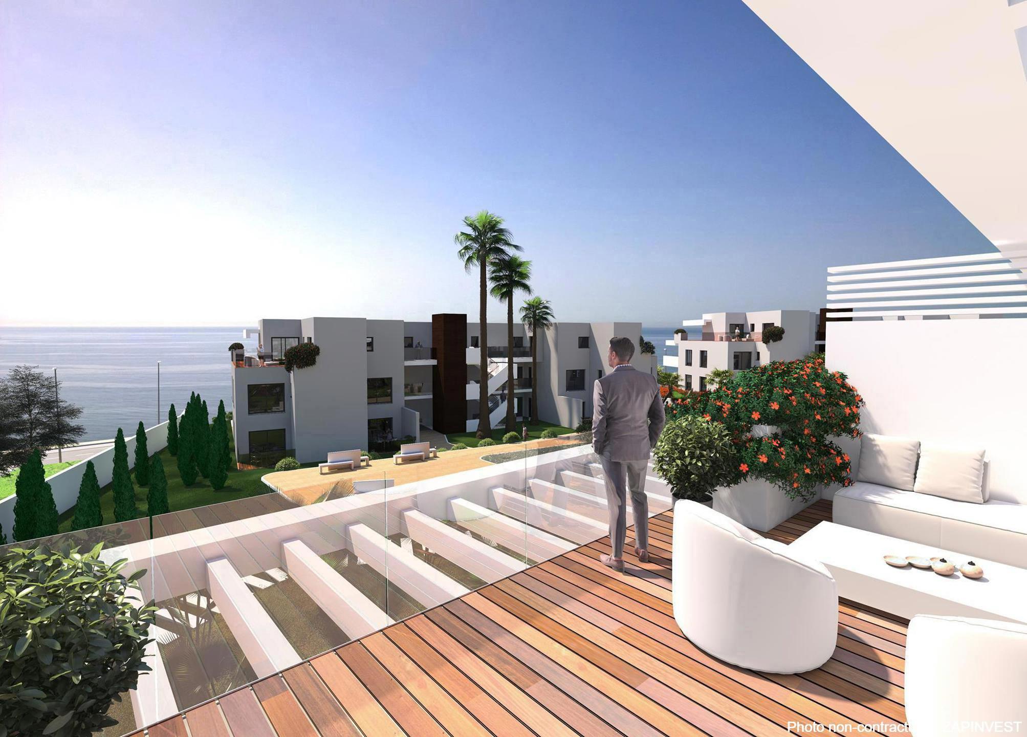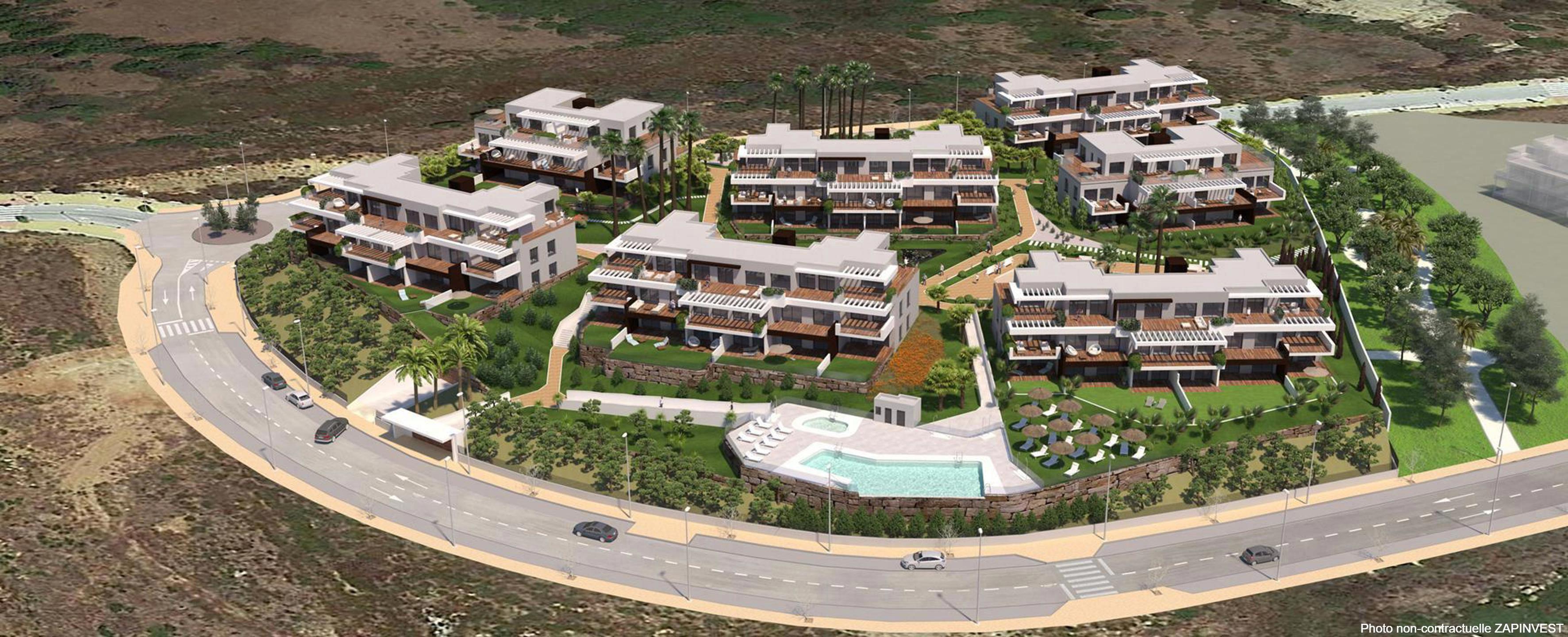 Nouveau projet sur plan, de seulement 74 appartements de 2 et 3 chambres distribué en 7 blocs distribué sur deux étages avec un design contemporain, idéalement situé sur une petite colline, à 800 mètres de la plage, avec des vues 360º sur la mer pour la plupart des appartements.