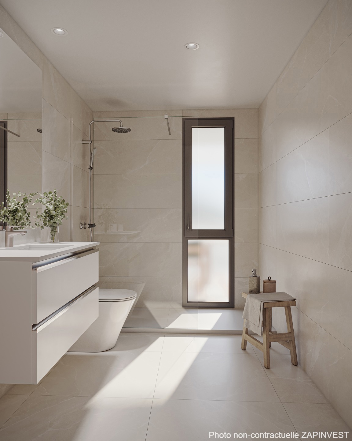 Dès l'entrée, vous avez immédiatement à main gauhe la chambre parentale avec sa salle de bains et son dressing en suite qui donne sur la magnifique terrasse.