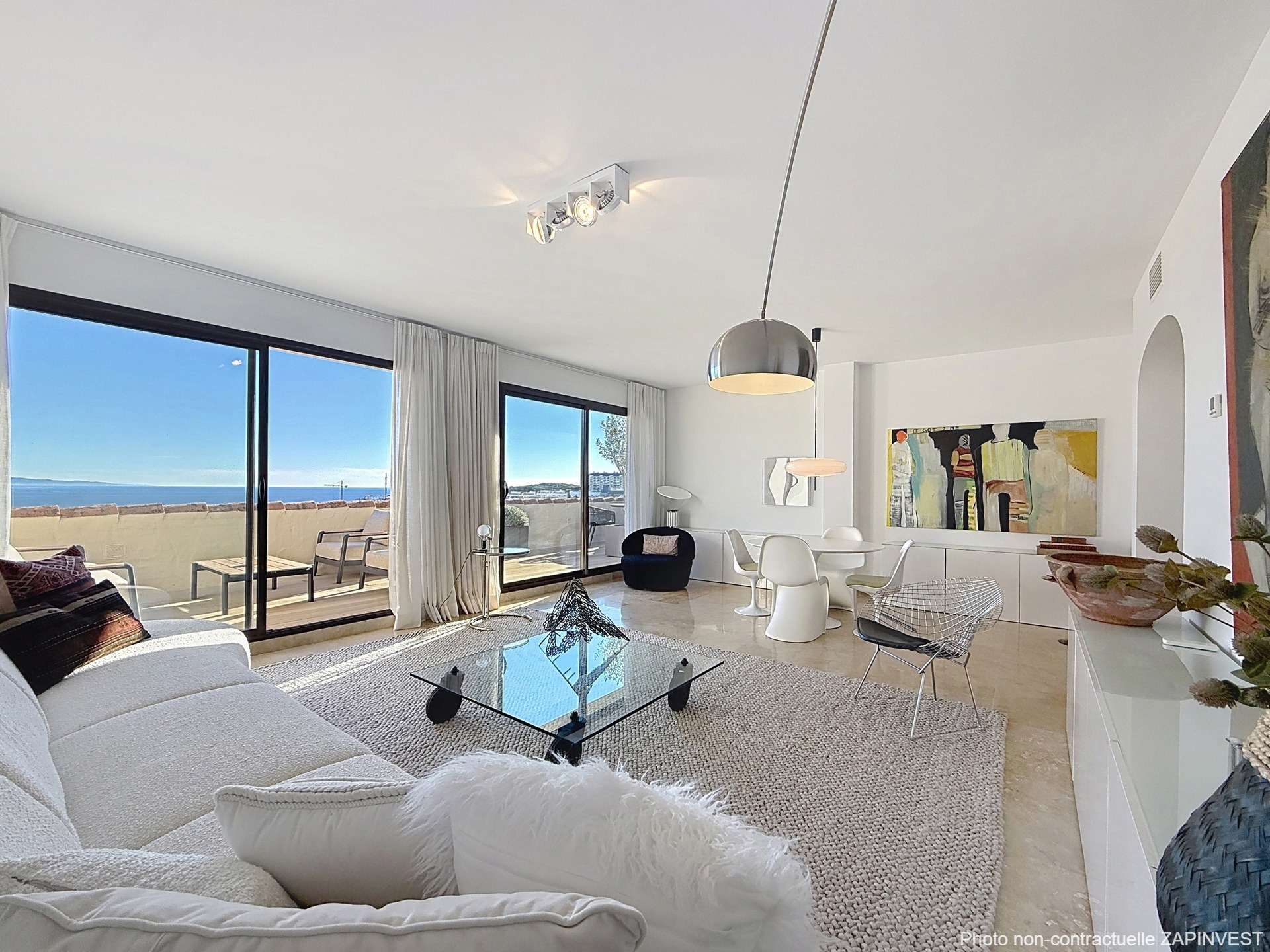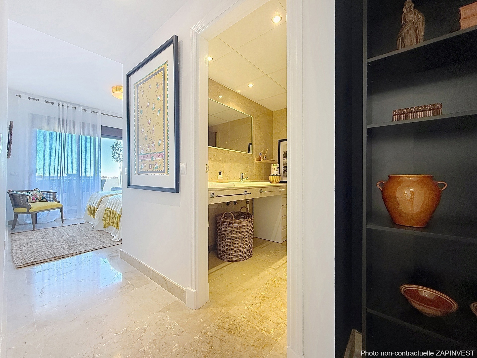 Dès l’entrée, la sensation d’espace et la clarté naturelle s’imposent, renforcées par une lucarne dans le hall, avec une première perspective ouverte sur la mer.