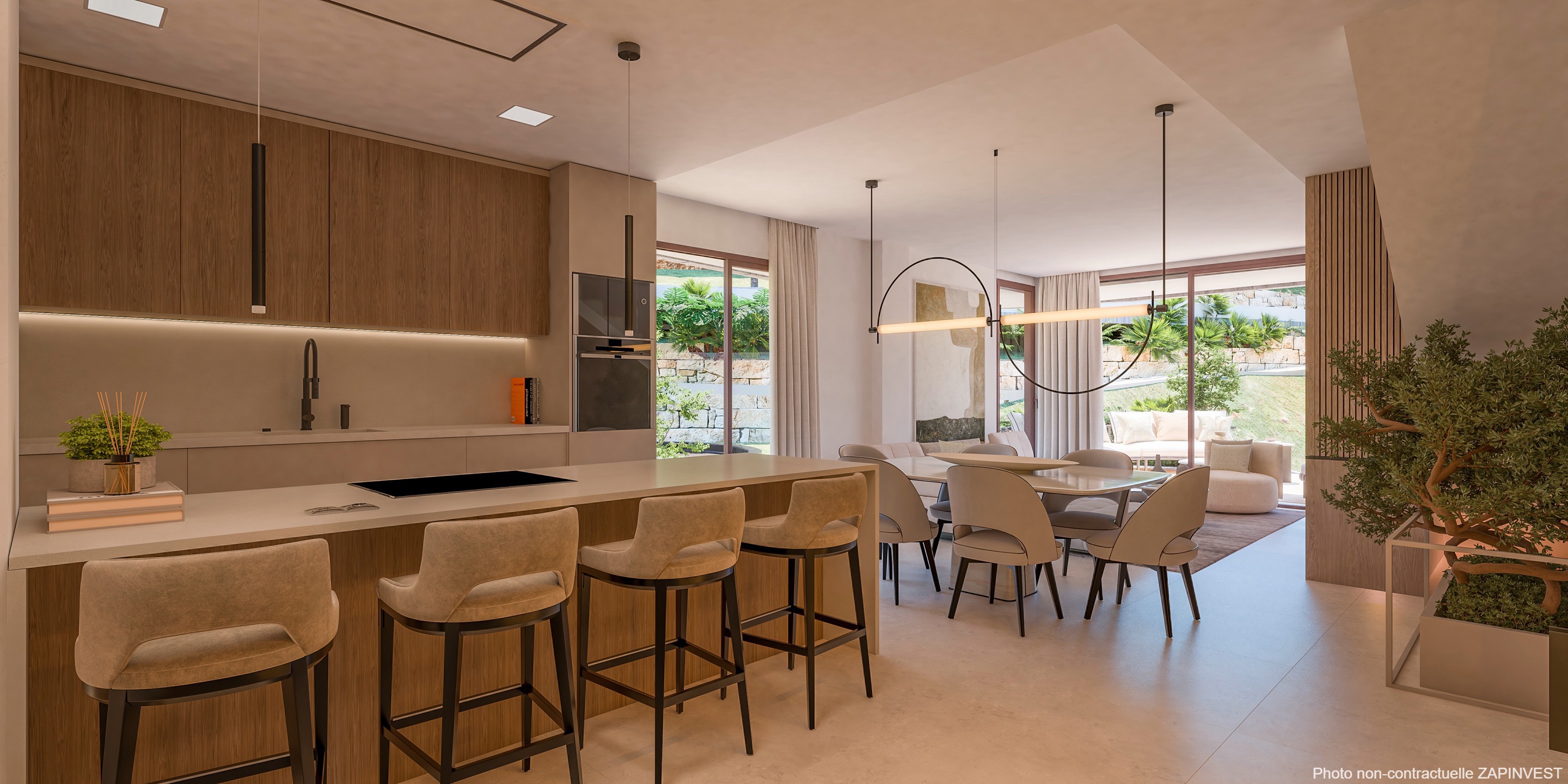 L’entrée de l’appartement donne immédiatement sur le magnifique espace constitué de la cuisine ouverte, de la salle à manger et du salon, le tout donnant sur une magnifique terrasse.