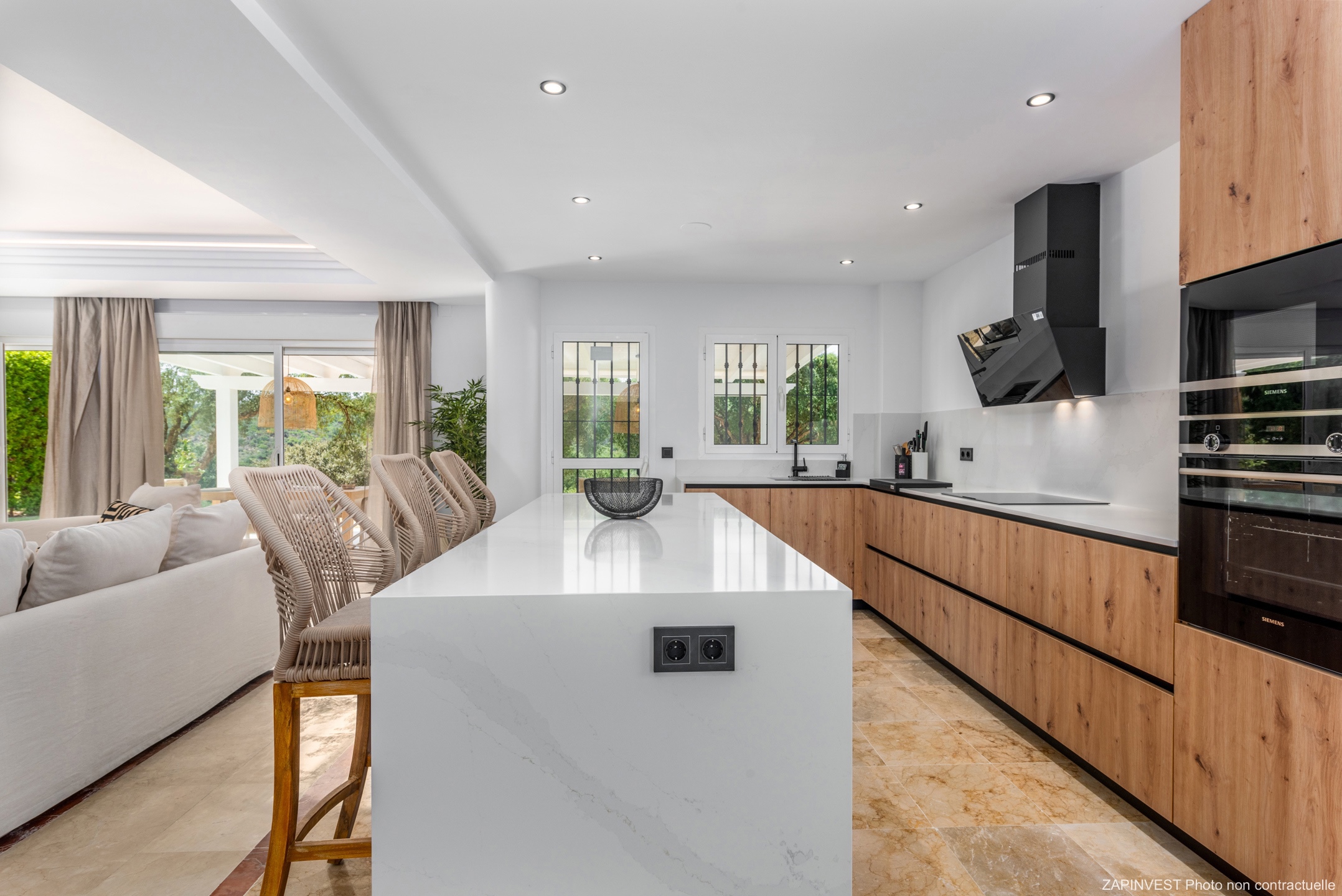 Spacieux et lumineux, il propose une superbe cuisine américaine entièrement équipée et un grand salon/salle à manger ouvert sur une splendide vue sur le magnifique golf de San Roque. La cuisine et le living disposent tous deux de splendides baies vitrées avec accès à la grande terrasse de plus de 70m² et un jardin de 379m² au total, face au golf.